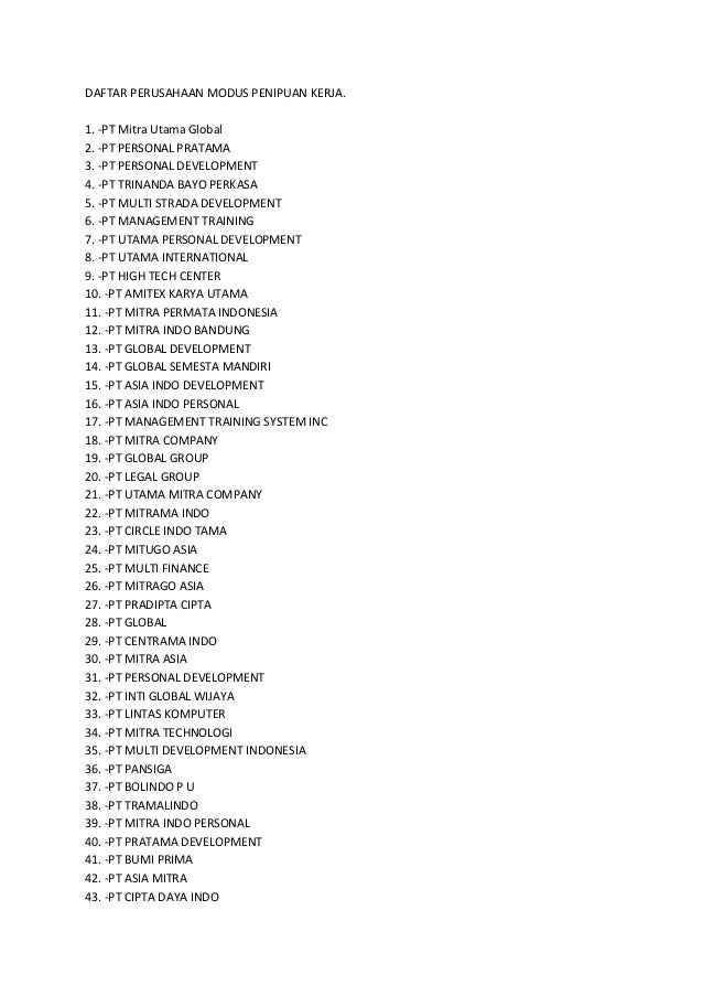 - 1. DAFTAR PERUSAHAAN MODUS PENIPUAN KERJA. 1. -PT Mitra Utama Global 2. -PT PERSONAL PRATAMA 3. -PT PERSONAL DEVELOPMENT 4. -PT TRINANDA BAYO PERKASA 5. -PT MULTI STRADA DEVELOPMENT 6. -PT MANAGEMENT TRAINING 7. -PT UTAMA PERSONAL DEVELOPMENT 8. -PT UTAMA INTERNATIONAL 9. -PT HIGH TECH CENTER 10. -PT AMITEX KARYA UTAMA 11. -PT MITRA PERMATA INDONESIA 12. -PT MITRA INDO BANDUNG 13. -PT GLOBAL DEVELOPMENT 14. -PT GLOBAL SEMESTA MANDIRI 15. -PT ASIA INDO DEVELOPMENT 16. -PT ASIA INDO PERSONAL 17. -PT MANAGEMENT TRAINING SYSTEM INC 18. -PT MITRA COMPANY 19. -PT GLOBAL GROUP 20. -PT LEGAL GROUP 21. -PT UTAMA MITRA COMPANY 22. -PT MITRAMA INDO 23. -PT CIRCLE INDO TAMA 24. -PT MITUGO ASIA 25. -PT MULTI FINANCE 26. -PT MITRAGO ASIA 27. -PT PRADIPTA CIPTA 28. -PT GLOBAL 29. -PT CENTRAMA INDO 30. -PT MITRA ASIA 31. -PT PERSONAL DEVELOPMENT 32. -PT INTI GLOBAL WIJAYA 33. -PT LINTAS KOMPUTER 34. -PT MITRA TECHNOLOGI 35. -PT MULTI DEVELOPMENT INDONESIA 36. -PT PANSIGA 37. -PT BOLINDO P U 38. -PT TRAMALINDO 39. -PT MITRA INDO PERSONAL 40. -PT PRATAMA DEVELOPMENT 41. -PT BUMI PRIMA 42. -PT ASIA MITRA 43. -PT CIPTA DAYA INDO