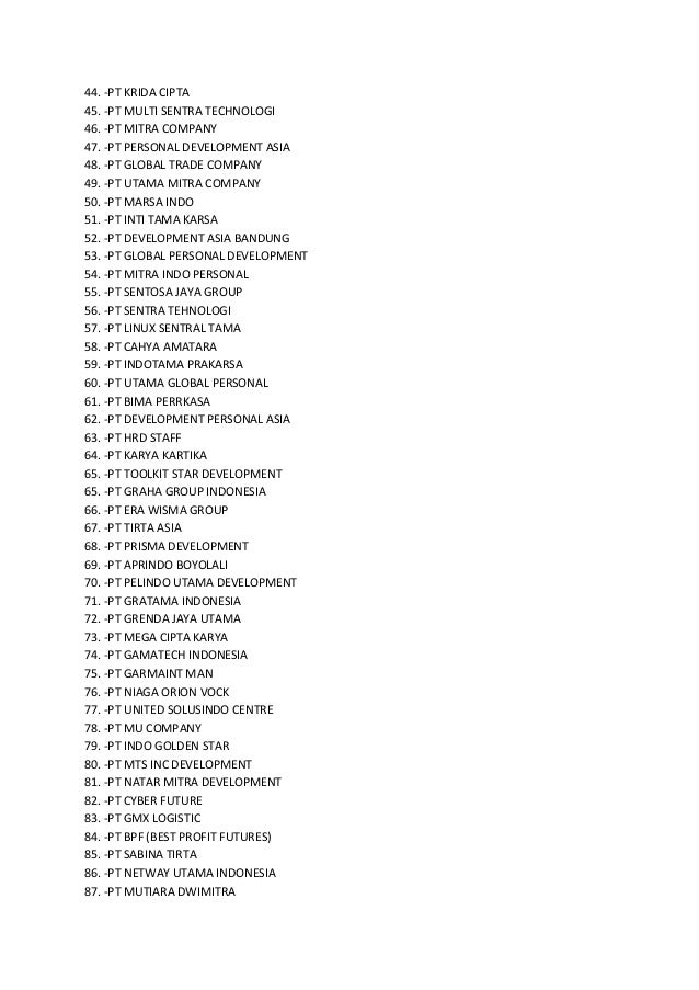- 2. 44. -PT KRIDA CIPTA 45. -PT MULTI SENTRA TECHNOLOGI 46. -PT MITRA COMPANY 47. -PT PERSONAL DEVELOPMENT ASIA 48. -PT GLOBAL TRADE COMPANY 49. -PT UTAMA MITRA COMPANY 50. -PT MARSA INDO 51. -PT INTI TAMA KARSA 52. -PT DEVELOPMENT ASIA BANDUNG 53. -PT GLOBAL PERSONAL DEVELOPMENT 54. -PT MITRA INDO PERSONAL 55. -PT SENTOSA JAYA GROUP 56. -PT SENTRA TEHNOLOGI 57. -PT LINUX SENTRAL TAMA 58. -PT CAHYA AMATARA 59. -PT INDOTAMA PRAKARSA 60. -PT UTAMA GLOBAL PERSONAL 61. -PT BIMA PERRKASA 62. -PT DEVELOPMENT PERSONAL ASIA 63. -PT HRD STAFF 64. -PT KARYA KARTIKA 65. -PT TOOLKIT STAR DEVELOPMENT 65. -PT GRAHA GROUP INDONESIA 66. -PT ERA WISMA GROUP 67. -PT TIRTA ASIA 68. -PT PRISMA DEVELOPMENT 69. -PT APRINDO BOYOLALI 70. -PT PELINDO UTAMA DEVELOPMENT 71. -PT GRATAMA INDONESIA 72. -PT GRENDA JAYA UTAMA 73. -PT MEGA CIPTA KARYA 74. -PT GAMATECH INDONESIA 75. -PT GARMAINT MAN 76. -PT NIAGA ORION VOCK 77. -PT UNITED SOLUSINDO CENTRE 78. -PT MU COMPANY 79. -PT INDO GOLDEN STAR 80. -PT MTS INC DEVELOPMENT 81. -PT NATAR MITRA DEVELOPMENT 82. -PT CYBER FUTURE 83. -PT GMX LOGISTIC 84. -PT BPF (BEST PROFIT FUTURES) 85. -PT SABINA TIRTA 86. -PT NETWAY UTAMA INDONESIA 87. -PT MUTIARA DWIMITRA