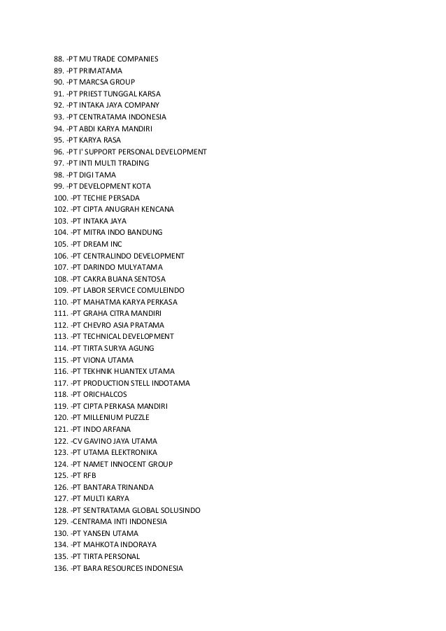 - 3. 88. -PT MU TRADE COMPANIES 89. -PT PRIMATAMA 90. -PT MARCSA GROUP 91. -PT PRIEST TUNGGAL KARSA 92. -PT INTAKA JAYA COMPANY 93. -PT CENTRATAMA INDONESIA 94. -PT ABDI KARYA MANDIRI 95. -PT KARYA RASA 96. -PT I' SUPPORT PERSONAL DEVELOPMENT 97. -PT INTI MULTI TRADING 98. -PT DIGI TAMA 99. -PT DEVELOPMENT KOTA 100. -PT TECHIE PERSADA 102. -PT CIPTA ANUGRAH KENCANA 103. -PT INTAKA JAYA 104. -PT MITRA INDO BANDUNG 105. -PT DREAM INC 106. -PT CENTRALINDO DEVELOPMENT 107. -PT DARINDO MULYATAMA 108. -PT CAKRA BUANA SENTOSA 109. -PT LABOR SERVICE COMULEINDO 110. -PT MAHATMA KARYA PERKASA 111. -PT GRAHA CITRA MANDIRI 112. -PT CHEVRO ASIA PRATAMA 113. -PT TECHNICAL DEVELOPMENT 114. -PT TIRTA SURYA AGUNG 115. -PT VIONA UTAMA 116. -PT TEKHNIK HUANTEX UTAMA 117. -PT PRODUCTION STELL INDOTAMA 118. -PT ORICHALCOS 119. -PT CIPTA PERKASA MANDIRI 120. -PT MILLENIUM PUZZLE 121. -PT INDO ARFANA 122. -CV GAVINO JAYA UTAMA 123. -PT UTAMA ELEKTRONIKA 124. -PT NAMET INNOCENT GROUP 125. -PT RFB 126. -PT BANTARA TRINANDA 127. -PT MULTI KARYA 128. -PT SENTRATAMA GLOBAL SOLUSINDO 129. -CENTRAMA INTI INDONESIA 130. -PT YANSEN UTAMA 134. -PT MAHKOTA INDORAYA 135. -PT TIRTA PERSONAL 136. -PT BARA RESOURCES INDONESIA