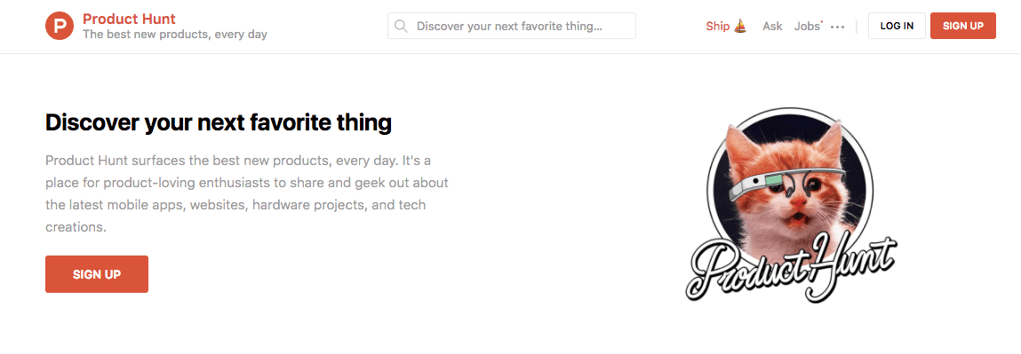 Product Hunt surfaces the best new products, every day. It’s a place for product-loving enthusiasts to share and geek out about the latest mobile apps, websites, hardware projects, and tech creations. (source)