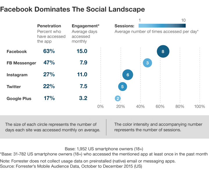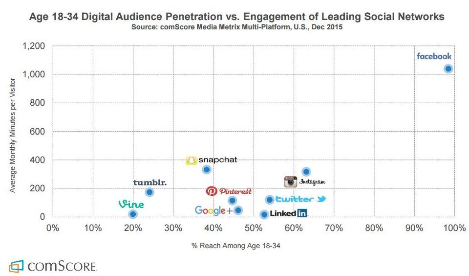 The above chart from Comscore shows engagement in terms of time spent on the platform vs reach among the millennial demographic. It's interesting to see how effectively Facebook dominates, but also interesting to see how well Snapchat and Instagram are doing in terms monthly usage per visitor. For more Snapchat stats, see our post on Snapchat Marketing Statistics.